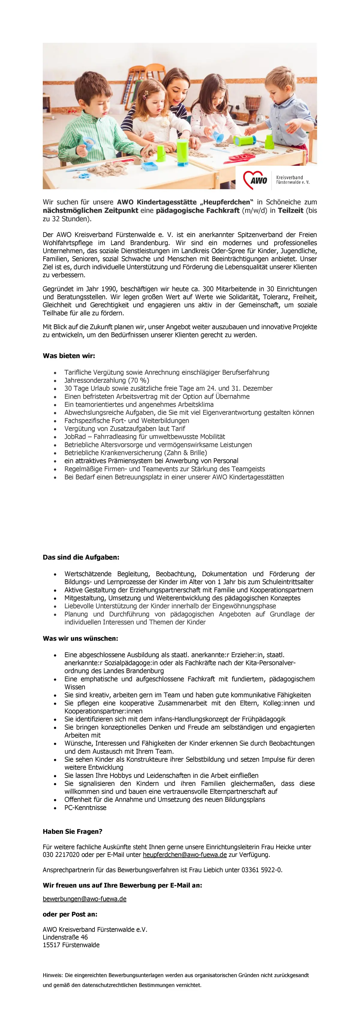 "pdfupload_content": "Wir suchen f\u00fcr unsere AWO Kindertagesst\u00e4tte \u201eHeupferdchen\u201c in Sch\u00f6neiche zum n\u00e4chstm\u00f6glichen Zeitpunkt eine p\u00e4dagogische Fachkraft (m\/w\/d) in Teilzeit (bis zu 32 Stunden). Der AWO Kreisverband F\u00fcrstenwalde e. V. ist ein anerkannter Spitzenverband der Freien Wohlfahrtspflege im Land Brandenburg. Wir sind ein modernes und professionelles Unternehmen, das soziale Dienstleistungen im Landkreis Oder-Spree f\u00fcr Kinder, Jugendliche, Familien, Senioren, sozial Schwache und Menschen mit Beeintr\u00e4chtigungen anbietet. Unser Ziel ist es, durch individuelle Unterst\u00fctzung und F\u00f6rderung die Lebensqualit\u00e4t unserer Klienten zu verbessern. Gegr\u00fcndet im Jahr 1990, besch\u00e4ftigen wir heute ca. 300 Mitarbeitende in 30 Einrichtungen und Beratungsstellen. Wir legen gro\u00dfen Wert auf Werte wie Solidarit\u00e4t, Toleranz, Freiheit, Gleichheit und Gerechtigkeit und engagieren uns aktiv in der Gemeinschaft, um soziale Teilhabe f\u00fcr alle zu f\u00f6rdern. Mit Blick auf die Zukunft planen wir, unser Angebot weiter auszubauen und innovative Projekte zu entwickeln, um den Bed\u00fcrfnissen unserer Klienten gerecht zu werden. Was bieten wir: \u2022 \u2022 \u2022 \u2022 \u2022 \u2022 \u2022 \u2022 \u2022 \u2022 \u2022 \u2022 \u2022 \u2022 Tarifliche Verg\u00fctung sowie Anrechnung einschl\u00e4giger Berufserfahrung Jahressonderzahlung (70 %) 30 Tage Urlaub sowie zus\u00e4tzliche freie Tage am 24. und 31. Dezember Einen befristeten Arbeitsvertrag mit der Option auf \u00dcbernahme Ein teamorientiertes und angenehmes Arbeitsklima Abwechslungsreiche Aufgaben, die Sie mit viel Eigenverantwortung gestalten k\u00f6nnen Fachspezifische Fort- und Weiterbildungen Verg\u00fctung von Zusatzaufgaben laut Tarif JobRad \u2013 Fahrradleasing f\u00fcr umweltbewusste Mobilit\u00e4t Betriebliche Altersvorsorge und verm\u00f6genswirksame Leistungen Betriebliche Krankenversicherung (Zahn & Brille) ein attraktives Pr\u00e4miensystem bei Anwerbung von Personal Regelm\u00e4\u00dfige Firmen- und Teamevents zur St\u00e4rkung des Teamgeists Bei Bedarf einen Betreuungsplatz in einer unserer AWO Kindertagesst\u00e4tten Das sind die Aufgaben: \u2022 \u2022 \u2022 \u2022 \u2022 Wertsch\u00e4tzende Begleitung, Beobachtung, Dokumentation und F\u00f6rderung der Bildungs- und Lernprozesse der Kinder im Alter von 1 Jahr bis zum Schuleintrittsalter Aktive Gestaltung der Erziehungspartnerschaft mit Familie und Kooperationspartnern Mitgestaltung, Umsetzung und Weiterentwicklung des p\u00e4dagogischen Konzeptes Liebevolle Unterst\u00fctzung der Kinder innerhalb der Eingew\u00f6hnungsphase Planung und Durchf\u00fchrung von p\u00e4dagogischen Angeboten auf Grundlage der individuellen Interessen und Themen der Kinder Was wir uns w\u00fcnschen: \u2022 \u2022 \u2022 \u2022 \u2022 \u2022 \u2022 \u2022 \u2022 \u2022 \u2022 \u2022 Eine abgeschlossene Ausbildung als staatl. anerkannte:r Erzieher:in, staatl. anerkannte:r Sozialpädagoge:in oder als Fachkr\u00e4fte nach der Kita-Personalverordnung des Landes Brandenburg Eine emphatische und aufgeschlossene Fachkraft mit fundiertem, p\u00e4dagogischem Wissen Sie sind kreativ, arbeiten gern im Team und haben gute kommunikative F\u00e4higkeiten Sie pflegen eine kooperative Zusammenarbeit mit den Eltern, Kolleg:innen und Kooperationspartner:innen Sie identifizieren sich mit dem infans-Handlungskonzept der Fr\u00fchp\u00e4dagogik Sie bringen konzeptionelles Denken und Freude am selbst\u00e4ndigen und engagierten Arbeiten mit W\u00fcnsche, Interessen und F\u00e4higkeiten der Kinder erkennen Sie durch Beobachtungen und dem Austausch mit Ihrem Team. Sie sehen Kinder als Konstrukteure ihrer Selbstbildung und setzen Impulse f\u00fcr deren weitere Entwicklung Sie lassen Ihre Hobbys und Leidenschaften in die Arbeit einflie\u00dfen Sie signalisieren den Kindern und ihren Familien gleicherma\u00dfen, dass diese willkommen sind und bauen eine vertrauensvolle Elternpartnerschaft auf Offenheit f\u00fcr die Annahme und Umsetzung des neuen Bildungsplans PC-Kenntnisse Haben Sie Fragen? F\u00fcr weitere fachliche Ausk\u00fcnfte steht Ihnen gerne unsere Einrichtungsleiterin Frau Heicke unter 030 2217020 oder per E-Mail unter heupferdchen@awo-fuewa.de zur Verf\u00fcgung. Ansprechpartnerin f\u00fcr das Bewerbungsverfahren ist Frau Liebich unter 03361 5922-0. Wir freuen uns auf Ihre Bewerbung per E-Mail an: bewerbungen@awo-fuewa.de oder per Post an: AWO Kreisverband F\u00fcrstenwalde e.V. Lindenstra\u00dfe 46 15517 F\u00fcrstenwalde Hinweis: Die eingereichten Bewerbungsunterlagen werden aus organisatorischen Gr\u00fcnden nicht zur\u00fcckgesandt und gem\u00e4\u00df den datenschutzrechtlichen Bestimmungen vernichtet."