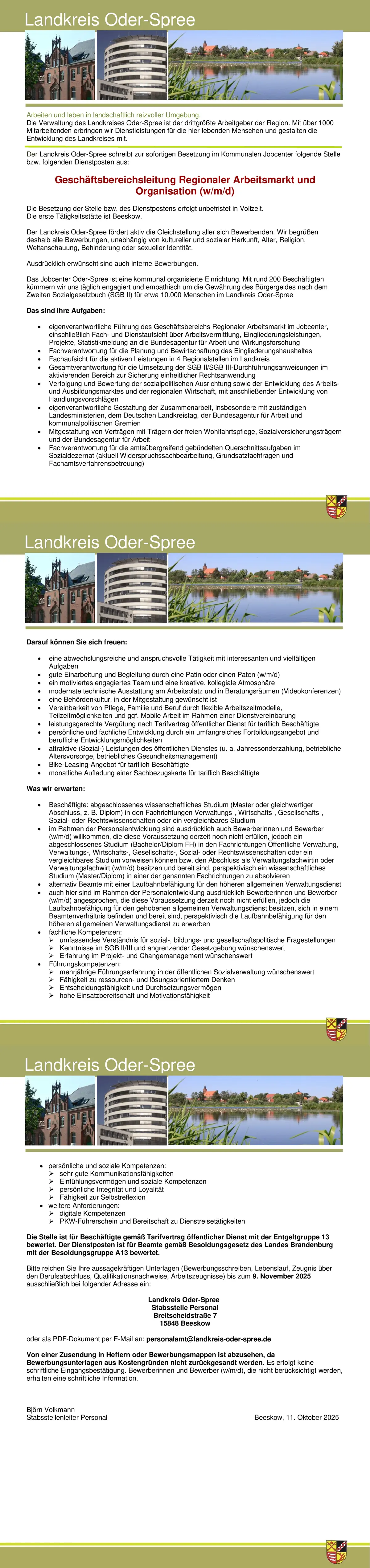 "pdfupload_content": "[Geben Sie Text ein] Landkreis Oder-Spree Arbeiten und leben in landschaftlich reizvoller Umgebung. Die Verwaltung des Landkreises Oder-Spree ist der drittgr\u00f6\u00dfte Arbeitgeber der Region. Mit \u00fcber 1000 Mitarbeitenden erbringen wir Dienstleistungen f\u00fcr die hier lebenden Menschen und gestalten die Entwicklung des Landkreises mit. Der Landkreis Oder-Spree schreibt zur sofortigen Besetzung im Kommunalen Jobcenter folgende Stelle bzw. folgenden Dienstposten aus: Gesch\u00e4ftsbereichsleitung Regionaler Arbeitsmarkt und Organisation (w\/m\/d) Die Besetzung der Stelle bzw. des Dienstpostens erfolgt unbefristet in Vollzeit. Die erste T\u00e4tigkeitsst\u00e4tte ist Beeskow. Der Landkreis Oder-Spree f\u00f6rdert aktiv die Gleichstellung aller sich Bewerbenden. Wir begr\u00fc\u00dfen deshalb alle Bewerbungen, unabh\u00e4ngig von kultureller und sozialer Herkunft, Alter, Religion, Weltanschauung, Behinderung oder sexueller Identit\u00e4t. Ausdr\u00fccklich erw\u00fcnscht sind auch interne Bewerbungen. Das Jobcenter Oder-Spree ist eine kommunal organisierte Einrichtung. Mit rund 200 Besch\u00e4ftigten k\u00fcmmern wir uns t\u00e4glich engagiert und empathisch um die Gew\u00e4hrung des B\u00fcrgergeldes nach dem Zweiten Sozialgesetzbuch (SGB II) f\u00fcr etwa 10.000 Menschen im Landkreis Oder-Spree Das sind Ihre Aufgaben: \u2022 \u2022 \u2022 \u2022 \u2022 \u2022 \u2022 \u2022 eigenverantwortliche F\u00fchrung des Gesch\u00e4ftsbereichs Regionaler Arbeitsmarkt im Jobcenter, einschlie\u00dflich Fach- und Dienstaufsicht \u00fcber Arbeitsvermittlung, Eingliederungsleistungen, Projekte, Statistikmeldung an die Bundesagentur f\u00fcr Arbeit und Wirkungsforschung Fachverantwortung f\u00fcr die Planung und Bewirtschaftung des Eingliederungshaushaltes Fachaufsicht f\u00fcr die aktiven Leistungen in 4 Regionalstellen im Landkreis Gesamtverantwortung f\u00fcr die Umsetzung der SGB II\/SGB III-Durchf\u00fchrungsanweisungen im aktivierenden Bereich zur Sicherung einheitlicher Rechtsanwendung Verfolgung und Bewertung der sozialpolitischen Ausrichtung sowie der Entwicklung des Arbeitsund Ausbildungsmarktes und der regionalen Wirtschaft, mit anschlie\u00dfender Entwicklung von Handlungsvorschl\u00e4gen eigenverantwortliche Gestaltung der Zusammenarbeit, insbesondere mit zust\u00e4ndigen Landesministerien, dem Deutschen Landkreistag, der Bundesagentur f\u00fcr Arbeit und kommunalpolitischen Gremien Mitgestaltung von Vertr\u00e4gen mit Tr\u00e4gern der freien Wohlfahrtspflege, Sozialversicherungstr\u00e4gern und der Bundesagentur f\u00fcr Arbeit Fachverantwortung f\u00fcr die amts\u00fcbergreifend geb\u00fcndelten Querschnittsaufgaben im Sozialdezernat (aktuell Widerspruchssachbearbeitung, Grundsatzfachfragen und Fachamtsverfahrensbetreuung) [Geben Sie Text ein] Landkreis Oder-Spree Darauf k\u00f6nnen Sie sich freuen: \u2022 \u2022 \u2022 \u2022 \u2022 \u2022 \u2022 \u2022 \u2022 \u2022 \u2022 eine abwechslungsreiche und anspruchsvolle T\u00e4tigkeit mit interessanten und vielf\u00e4ltigen Aufgaben gute Einarbeitung und Begleitung durch eine Patin oder einen Paten (w\/m\/d) ein motiviertes engagiertes Team und eine kreative, kollegiale Atmosph\u00e4re modernste technische Ausstattung am Arbeitsplatz und in Beratungsr\u00e4umen (Videokonferenzen) eine Beh\u00f6rdenkultur, in der Mitgestaltung gew\u00fcnscht ist Vereinbarkeit von Pflege, Familie und Beruf durch flexible Arbeitszeitmodelle, Teilzeitm\u00f6glichkeiten und ggf. Mobile Arbeit im Rahmen einer Dienstvereinbarung leistungsgerechte Verg\u00fctung nach Tarifvertrag \u00f6ffentlicher Dienst f\u00fcr tariflich Besch\u00e4ftigte pers\u00f6nliche und fachliche Entwicklung durch ein umfangreiches Fortbildungsangebot und berufliche Entwicklungsm\u00f6glichkeiten attraktive (Sozial-) Leistungen des \u00f6ffentlichen Dienstes (u. a. Jahressonderzahlung, betriebliche Altersvorsorge, betriebliches Gesundheitsmanagement) Bike-Leasing-Angebot f\u00fcr tariflich Besch\u00e4ftigte monatliche Aufladung einer Sachbezugskarte f\u00fcr tariflich Besch\u00e4ftigte Was wir erwarten: \u2022 \u2022 \u2022 \u2022 \u2022 \u2022 Besch\u00e4ftigte: abgeschlossenes wissenschaftliches Studium (Master oder gleichwertiger Abschluss, z. B. Diplom) in den Fachrichtungen Verwaltungs-, Wirtschafts-, Gesellschafts-, Sozial- oder Rechtswissenschaften oder ein vergleichbares Studium im Rahmen der Personalentwicklung sind ausdr\u00fccklich auch Bewerberinnen und Bewerber (w\/m\/d) willkommen, die diese Voraussetzung derzeit noch nicht erf\u00fcllen, jedoch ein abgeschlossenes Studium (Bachelor\/Diplom FH) in den Fachrichtungen \u00d6ffentliche Verwaltung, Verwaltungs-, Wirtschafts-, Gesellschafts-, Sozial- oder Rechtswissenschaften oder ein vergleichbares Studium vorweisen k\u00f6nnen bzw. den Abschluss als Verwaltungsfachwirtin oder Verwaltungsfachwirt (w\/m\/d) besitzen und bereit sind, perspektivisch ein wissenschaftliches Studium (Master\/Diplom) in einer der genannten Fachrichtungen zu absolvieren alternativ Beamte mit einer Laufbahnbef\u00e4higung f\u00fcr den h\u00f6heren allgemeinen Verwaltungsdienst auch hier sind im Rahmen der Personalentwicklung ausdr\u00fccklich Bewerberinnen und Bewerber (w\/m\/d) angesprochen, die diese Voraussetzung derzeit noch nicht erf\u00fcllen, jedoch die Laufbahnbef\u00e4higung f\u00fcr den gehobenen allgemeinen Verwaltungsdienst besitzen, sich in einem Beamtenverh\u00e4ltnis befinden und bereit sind, perspektivisch die Laufbahnbef\u00e4higung f\u00fcr den h\u00f6heren allgemeinen Verwaltungsdienst zu erwerben fachliche Kompetenzen: ➢ umfassendes Verst\u00e4ndnis f\u00fcr sozial-, bildungs- und gesellschaftspolitische Fragestellungen ➢ Kenntnisse im SGB II\/III und angrenzender Gesetzgebung w\u00fcnschenswert ➢ Erfahrung im Projekt- und Changemanagement w\u00fcnschenswert F\u00fchrungskompetenzen: ➢ mehrj\u00e4hrige F\u00fchrungserfahrung in der \u00f6ffentlichen Sozialverwaltung w\u00fcnschenswert ➢ F\u00e4higke