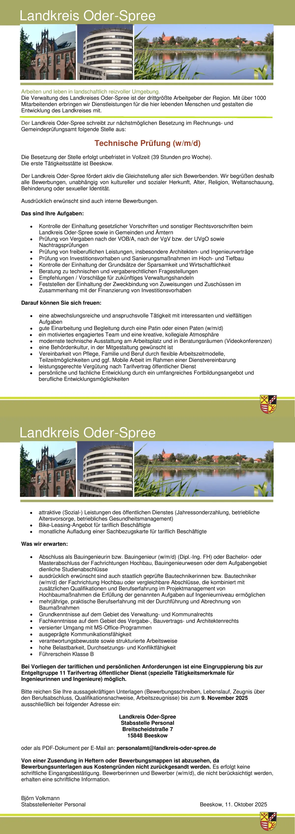 "pdfupload_content": "[Geben Sie Text ein] Landkreis Oder-Spree Arbeiten und leben in landschaftlich reizvoller Umgebung. Die Verwaltung des Landkreises Oder-Spree ist der drittgr\u00f6\u00dfte Arbeitgeber der Region. Mit \u00fcber 1000 Mitarbeitenden erbringen wir Dienstleistungen f\u00fcr die hier lebenden Menschen und gestalten die Entwicklung des Landkreises mit. Der Landkreis Oder-Spree schreibt zur n\u00e4chstm\u00f6glichen Besetzung im Rechnungs- und Gemeindepr\u00fcfungsamt folgende Stelle aus: Technische Pr\u00fcfung (w\/m\/d) Die Besetzung der Stelle erfolgt unbefristet in Vollzeit (39 Stunden pro Woche). Die erste T\u00e4tigkeitsst\u00e4tte ist Beeskow. Der Landkreis Oder-Spree f\u00f6rdert aktiv die Gleichstellung aller sich Bewerbenden. Wir begr\u00fc\u00dfen deshalb alle Bewerbungen, unabh\u00e4ngig von kultureller und sozialer Herkunft, Alter, Religion, Weltanschauung, Behinderung oder sexueller Identit\u00e4t. Ausdr\u00fccklich erw\u00fcnscht sind auch interne Bewerbungen. Das sind Ihre Aufgaben:         Kontrolle der Einhaltung gesetzlicher Vorschriften und sonstiger Rechtsvorschriften beim Landkreis Oder-Spree sowie in Gemeinden und \u00c4mtern Pr\u00fcfung von Vergaben nach der VOB\/A, nach der VgV bzw. der UVgO sowie Nachtragspr\u00fcfungen Pr\u00fcfung von freiberuflichen Leistungen, insbesondere Architekten- und Ingenieurvertr\u00e4ge Pr\u00fcfung von Investitionsvorhaben und Sanierungsma\u00dfnahmen im Hoch- und Tiefbau Kontrolle der Einhaltung der Grunds\u00e4tze der Sparsamkeit und Wirtschaftlichkeit Beratung zu technischen und vergaberechtlichen Fragestellungen Empfehlungen \/ Vorschl\u00e4ge f\u00fcr zuk\u00fcnftiges Verwaltungshandeln Feststellen der Einhaltung der Zweckbindung von Zuweisungen und Zusch\u00fcssen im Zusammenhang mit der Finanzierung von Investitionsvorhaben Darauf k\u00f6nnen Sie sich freuen:         eine abwechslungsreiche und anspruchsvolle T\u00e4tigkeit mit interessanten und vielf\u00e4ltigen Aufgaben gute Einarbeitung und Begleitung durch eine Patin oder einen Paten (w\/m\/d) ein motiviertes engagiertes Team und eine kreative, kollegiale Atmosph\u00e4re modernste technische Ausstattung am Arbeitsplatz und in Beratungsr\u00e4umen (Videokonferenzen) eine Beh\u00f6rdenkultur, in der Mitgestaltung gew\u00fcnscht ist Vereinbarkeit von Pflege, Familie und Beruf durch flexible Arbeitszeitmodelle, Teilzeitm\u00f6glichkeiten und ggf. Mobile Arbeit im Rahmen einer Dienstvereinbarung leistungsgerechte Verg\u00fctung nach Tarifvertrag \u00f6ffentlicher Dienst pers\u00f6nliche und fachliche Entwicklung durch ein umfangreiches Fortbildungsangebot und berufliche Entwicklungsm\u00f6glichkeiten [Geben Sie Text ein] Landkreis Oder-Spree    attraktive (Sozial-) Leistungen des \u00f6ffentlichen Dienstes (Jahressonderzahlung, betriebliche Altersvorsorge, betriebliches Gesundheitsmanagement) Bike-Leasing-Angebot f\u00fcr tariflich Besch\u00e4ftigte monatliche Aufladung einer Sachbezugskarte f\u00fcr tariflich Besch\u00e4ftigte Was wir erwarten:           Abschluss als Bauingenieurin bzw. Bauingenieur (w\/m\/d) (Dipl.-Ing. FH) oder Bachelor- oder Masterabschluss der Fachrichtungen Hochbau, Bauingenieurwesen oder dem Aufgabengebiet dienliche Studienabschl\u00fcsse ausdr\u00fccklich erw\u00fcnscht sind auch staatlich gepr\u00fcfte Bautechnikerinnen bzw. Bautechniker (w\/m\/d) der Fachrichtung Hochbau oder vergleichbare Abschl\u00fcsse, die kombiniert mit zus\u00e4tzlichen Qualifikationen und Berufserfahrung im Projektmanagement von Hochbauma\u00dfnahmen die Erf\u00fcllung der genannten Aufgaben auf Ingenieurniveau erm\u00f6glichen mehrj\u00e4hrige, praktische Berufserfahrung mit der Durchf\u00fchrung und Abrechnung von Bauma\u00dfnahmen Grundkenntnisse auf dem Gebiet des Verwaltung- und Kommunalrechts Fachkenntnisse auf dem Gebiet des Vergabe-, Bauvertrags- und Architektenrechts versierter Umgang mit MS-Office-Programmen ausgepr\u00e4gte Kommunikationsf\u00e4higkeit verantwortungsbewusste sowie strukturierte Arbeitsweise hohe Belastbarkeit, Durchsetzungs- und Konfliktf\u00e4higkeit F\u00fchrerschein Klasse B Bei Vorliegen der tariflichen und pers\u00f6nlichen Anforderungen ist eine Eingruppierung bis zur Entgeltgruppe 11 Tarifvertrag \u00f6ffentlicher Dienst (spezielle T\u00e4tigkeitsmerkmale f\u00fcr Ingenieurinnen und Ingenieure) m\u00f6glich. Bitte reichen Sie Ihre aussagekr\u00e4ftigen Unterlagen (Bewerbungsschreiben, Lebenslauf, Zeugnis \u00fcber den Berufsabschluss, Qualifikationsnachweise, Arbeitszeugnisse) bis zum 9. November 2025 ausschlie\u00dflich bei folgender Adresse ein: Landkreis Oder-Spree Stabsstelle Personal Breitscheidstra\u00dfe 7 15848 Beeskow oder als PDF-Dokument per E-Mail an: personalamt@landkreis-oder-spree.de Von einer Zusendung in Heftern oder Bewerbungsmappen ist abzusehen, da Bewerbungsunterlagen aus Kostengr\u00fcnden nicht zur\u00fcckgesandt werden. Es erfolgt keine schriftliche Eingangsbest\u00e4tigung. Bewerberinnen und Bewerber (w\/m\/d), die nicht ber\u00fccksichtigt werden, erhalten eine schriftliche Information. Bj\u00f6rn Volkmann Stabsstellenleiter Personal Beeskow, 11. Oktober 2025"