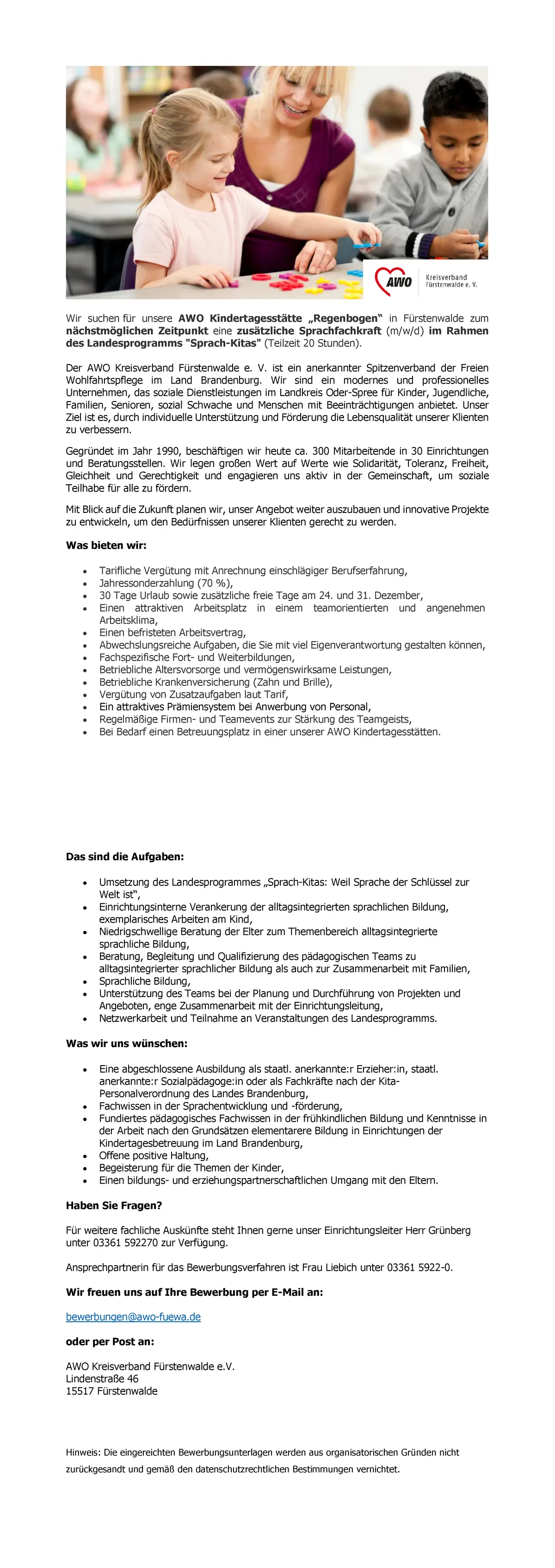 "pdfupload_content": "Wir suchen f\u00fcr unsere AWO Kindertagesst\u00e4tte \u201eRegenbogen\u201c in F\u00fcrstenwalde zum n\u00e4chstm\u00f6glichen Zeitpunkt eine zus\u00e4tzliche Sprachfachkraft (m\/w\/d) im Rahmen des Landesprogramms Sprach-Kitas (Teilzeit 20 Stunden). Der AWO Kreisverband F\u00fcrstenwalde e. V. ist ein anerkannter Spitzenverband der Freien Wohlfahrtspflege im Land Brandenburg. Wir sind ein modernes und professionelles Unternehmen, das soziale Dienstleistungen im Landkreis Oder-Spree f\u00fcr Kinder, Jugendliche, Familien, Senioren, sozial Schwache und Menschen mit Beeintr\u00e4chtigungen anbietet. Unser Ziel ist es, durch individuelle Unterst\u00fctzung und F\u00f6rderung die Lebensqualit\u00e4t unserer Klienten zu verbessern. Gegr\u00fcndet im Jahr 1990, besch\u00e4ftigen wir heute ca. 300 Mitarbeitende in 30 Einrichtungen und Beratungsstellen. Wir legen gro\u00dfen Wert auf Werte wie Solidarit\u00e4t, Toleranz, Freiheit, Gleichheit und Gerechtigkeit und engagieren uns aktiv in der Gemeinschaft, um soziale Teilhabe f\u00fcr alle zu f\u00f6rdern. Mit Blick auf die Zukunft planen wir, unser Angebot weiter auszubauen und innovative Projekte zu entwickeln, um den Bed\u00fcrfnissen unserer Klienten gerecht zu werden. Was bieten wir: \u2022 \u2022 \u2022 \u2022 \u2022 \u2022 \u2022 \u2022 \u2022 \u2022 \u2022 \u2022 \u2022 Tarifliche Verg\u00fctung mit Anrechnung einschl\u00e4giger Berufserfahrung, Jahressonderzahlung (70 %), 30 Tage Urlaub sowie zus\u00e4tzliche freie Tage am 24. und 31. Dezember, Einen attraktiven Arbeitsplatz in einem teamorientierten und angenehmen Arbeitsklima, Einen befristeten Arbeitsvertrag, Abwechslungsreiche Aufgaben, die Sie mit viel Eigenverantwortung gestalten k\u00f6nnen, Fachspezifische Fort- und Weiterbildungen, Betriebliche Altersvorsorge und verm\u00f6genswirksame Leistungen, Betriebliche Krankenversicherung (Zahn und Brille), Verg\u00fctung von Zusatzaufgaben laut Tarif, Ein attraktives Pr\u00e4miensystem bei Anwerbung von Personal, Regelm\u00e4\u00dfige Firmen- und Teamevents zur St\u00e4rkung des Teamgeists, Bei Bedarf einen Betreuungsplatz in einer unserer AWO Kindertagesst\u00e4tten. Das sind die Aufgaben: \u2022 \u2022 \u2022 \u2022 \u2022 \u2022 \u2022 Umsetzung des Landesprogrammes \u201eSprach-Kitas: Weil Sprache der Schl\u00fcssel zur Welt ist\u201c, Einrichtungsinterne Verankerung der alltagsintegrierten sprachlichen Bildung, exemplarisches Arbeiten am Kind, Niedrigschwellige Beratung der Elter zum Themenbereich alltagsintegrierte sprachliche Bildung, Beratung, Begleitung und Qualifizierung des p\u00e4dagogischen Teams zu alltagsintegrierter sprachlicher Bildung als auch zur Zusammenarbeit mit Familien, Sprachliche Bildung, Unterst\u00fctzung des Teams bei der Planung und Durchf\u00fchrung von Projekten und Angeboten, enge Zusammenarbeit mit der Einrichtungsleitung, Netzwerkarbeit und Teilnahme an Veranstaltungen des Landesprogramms. Was wir uns w\u00fcnschen: \u2022 \u2022 \u2022 \u2022 \u2022 \u2022 Eine abgeschlossene Ausbildung als staatl. anerkannte:r Erzieher:in, staatl. anerkannte:r Sozialpädagoge:in oder als Fachkr\u00e4fte nach der KitaPersonalverordnung des Landes Brandenburg, Fachwissen in der Sprachentwicklung und -f\u00f6rderung, Fundiertes p\u00e4dagogisches Fachwissen in der fr\u00fchkindlichen Bildung und Kenntnisse in der Arbeit nach den Grunds\u00e4tzen elementarere Bildung in Einrichtungen der Kindertagesbetreuung im Land Brandenburg, Offene positive Haltung, Begeisterung f\u00fcr die Themen der Kinder, Einen bildungs- und erziehungspartnerschaftlichen Umgang mit den Eltern. Haben Sie Fragen? F\u00fcr weitere fachliche Ausk\u00fcnfte steht Ihnen gerne unser Einrichtungsleiter Herr Gr\u00fcnberg unter 03361 592270 zur Verf\u00fcgung. Ansprechpartnerin f\u00fcr das Bewerbungsverfahren ist Frau Liebich unter 03361 5922-0. Wir freuen uns auf Ihre Bewerbung per E-Mail an: bewerbungen@awo-fuewa.de oder per Post an: AWO Kreisverband F\u00fcrstenwalde e.V. Lindenstra\u00dfe 46 15517 F\u00fcrstenwalde Hinweis: Die eingereichten Bewerbungsunterlagen werden aus organisatorischen Gr\u00fcnden nicht zur\u00fcckgesandt und gem\u00e4\u00df den datenschutzrechtlichen Bestimmungen vernichtet."